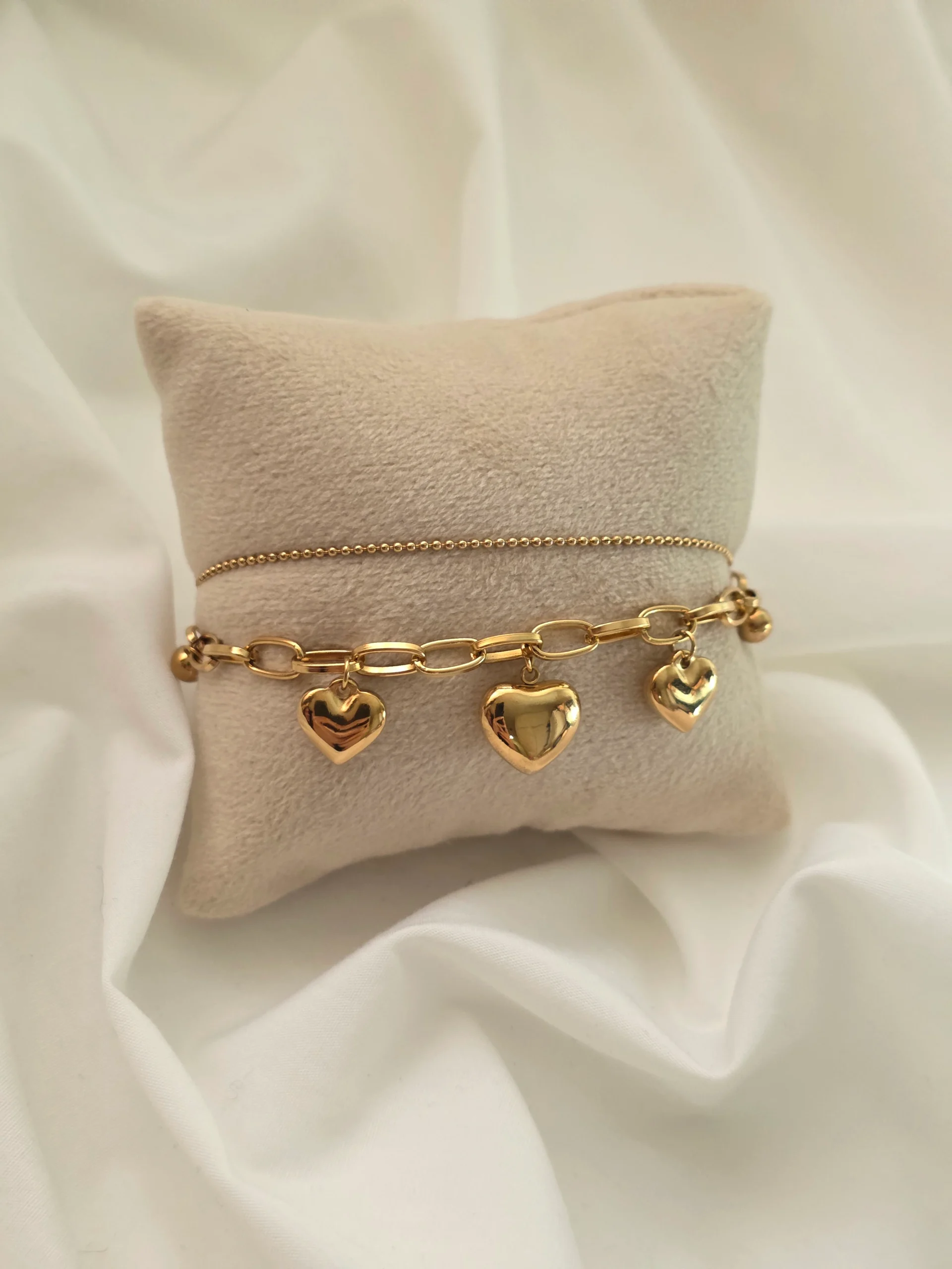 این دستبند زیبا با طراحی مدرن و آویزهای قلبی، انتخابی جذاب برای کسانی است که به جزئیات و زیبایی ظریف اهمیت میدهند. ترکیب زنجیر مستحکم و طلایی براق، جلوهای لوکس و خاص روی مچ دست ایجاد میکند و قابل استفاده در مهمانیها، قرارهای روزمره و حتی بهعنوان یک هدیهی عاشقانه است.
